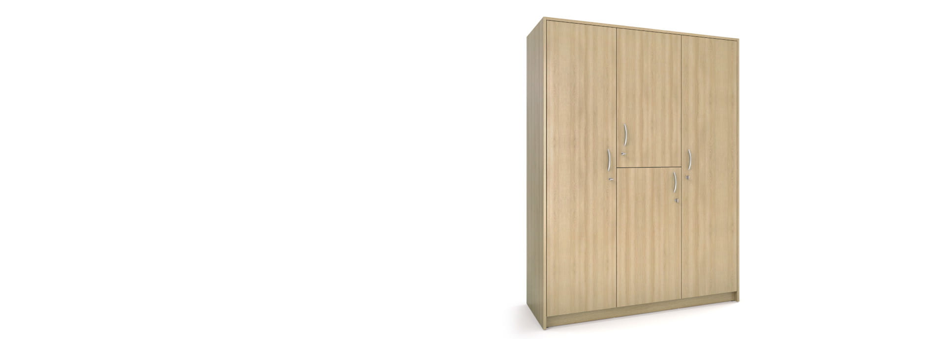 Armoire deux personnes à 4 portes, avec tringles à vêtements et étagères. Grâce aux 4 portes dotées de poignées incurvées ergonomiques de 128 mm, le résident bénéficie d'une excellente facilité d'accès à toutes les sections de l'armoire. Les amortisseurs intégrés minimisent le niveau de bruit lors de la fermeture des portes.