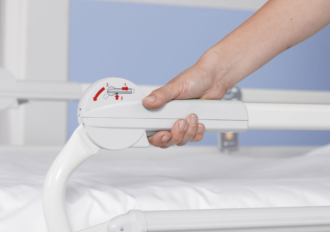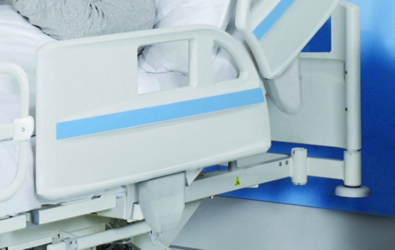 For a higher level of patient protection, the nurse can equip the bed with an independant protector and extension. The protector will lock the side rail in the 'up' posision automatically.