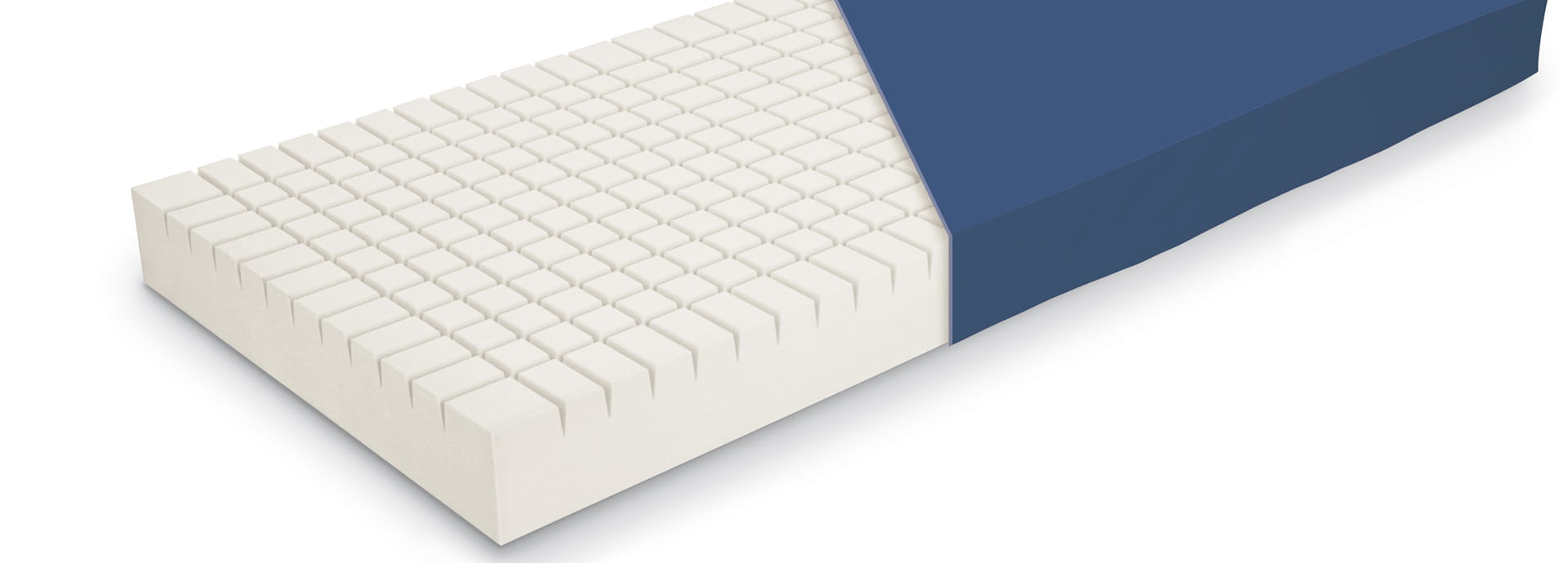 Le matelas PrimaCare 10 comporte une âme en mousse monobloc. La partie supérieure du matelas présente une découpe transversale et longitudinale uniformément répartie sur toute la surface. Cela permet une meilleure circulation de l’air entre la peau du patient et le matelas. Cette technologie contribue également à optimiser la répartition de la pression.